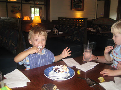 Hayden and Noel, however, had discovered ... THE DRAGON! Legends tells of a legendary dragon whose roller coaster skills were the stuff of legends!*** (Actually it was a itty bitty roller coaster that went in a very small circle.) Hayden LOVED it -- he would run off and get right back in line.